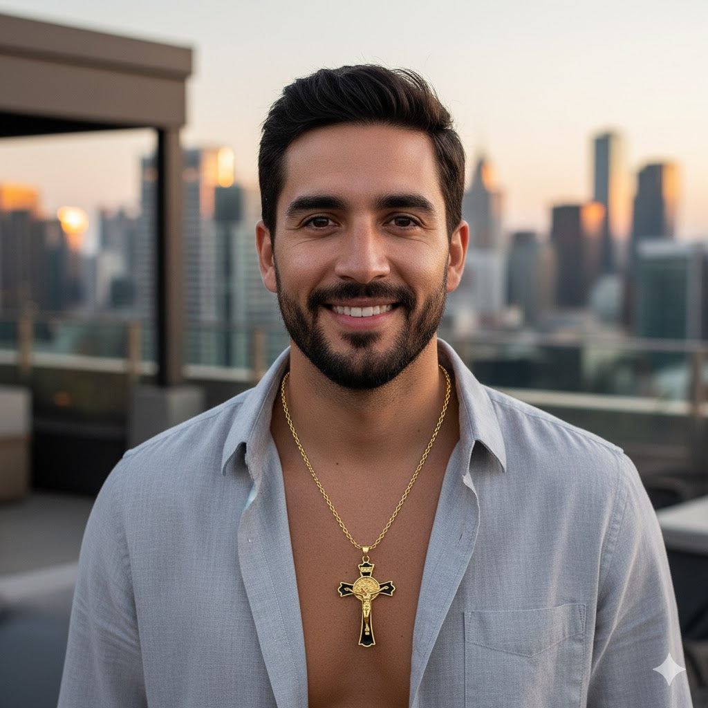 Fusión de Símbolos Sagrados: Más que un crucifijo. La medalla de San Benito está integrada detrás de Cristo, convirtiendo esta pieza en un doble amuleto de protección contra la negatividad.