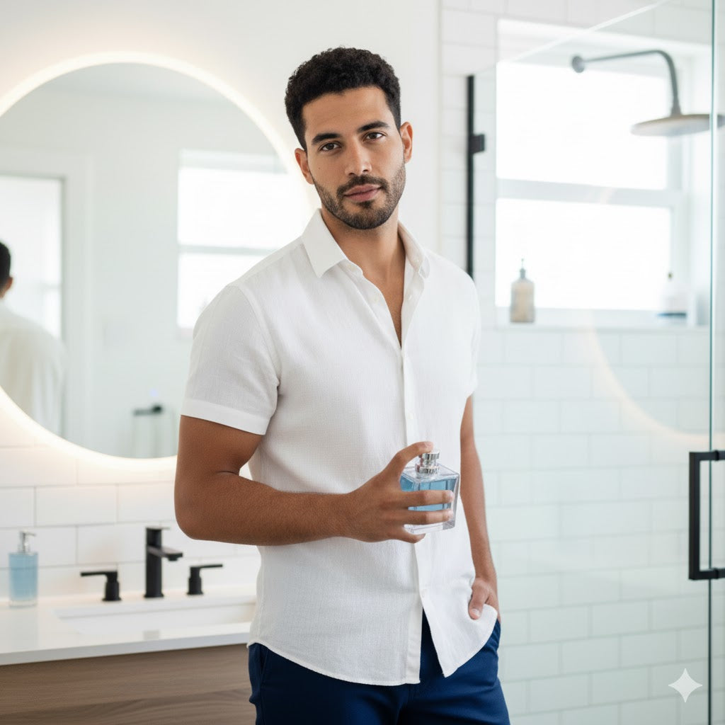 Corazón (Loto de Agua y Mimosa): El alma acuática y limpia. No es solo frescura; es una elegancia acuática y floral que le da un carácter sofisticado, suave y universalmente atractivo.