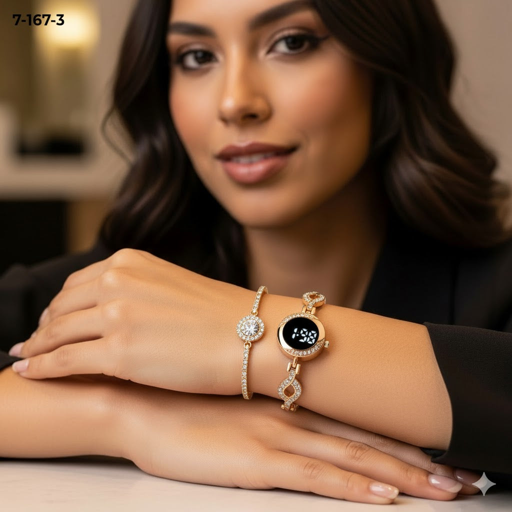 Redefine cómo miras el tiempo. El Set "Luxur Midnight Gold" no es un simple reloj; es una joya inteligente que cobra vida. Su esfera oscura y misteriosa se ilumina con la precisión digital LED solo cuando tú lo deseas, manteniéndose como un brazalete de lujo el resto del día. Rodeado de cristales que capturan la luz y acompañado por una pulsera a juego, este dúo es la fusión perfecta de modernidad y glamour clásico. El regalo definitivo de Luxur, listo para deslumbrar desde su estuche.